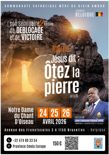 SEMINAIRE DE VICTOIRE - Communauté Catholique Mère du Divin Amour - Fraternité BelgiqueNotre Dame du Chant D'Oiseau - Bruxelles, Avenue des Franciscains 3, 1150 bruxellesven24avr(avr 24)18h00dim26(avr 26)15h0018h00 - 15h00 (26) Type d'évènementConférence,Retraite